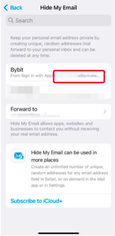 You can login to your Apple ID on your iPhone and select Log In with Apple when you want to login to your Bybit Account. If you have selected Hide My Email during registration and forgotten your email address, you can check your @privaterelay.appleid.com email address by going to your Apple Settings → iCloud → Apps Using iCloud → Hide My Email, and insert the email address indicated in the email address field. As such, we advise all users to change their commonly used email address once logging in their account for the first time. You can refer to the article How to Change/Unlink Your Registered Email Address for more information.