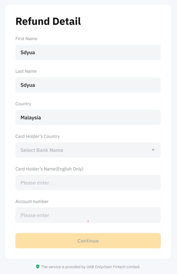When a refund is required, you will need to submit the refund details on the Buy Crypto Order page → Fiat deposit → hover to the Refund In Progress and click on Submit. Alternatively, you may also find the submission portal here. Please follow the instructions and submit the relevant documents which will be reviewed within 48 hours. Then, the refund process will take approximately 7-14 business days for the bank to refund.