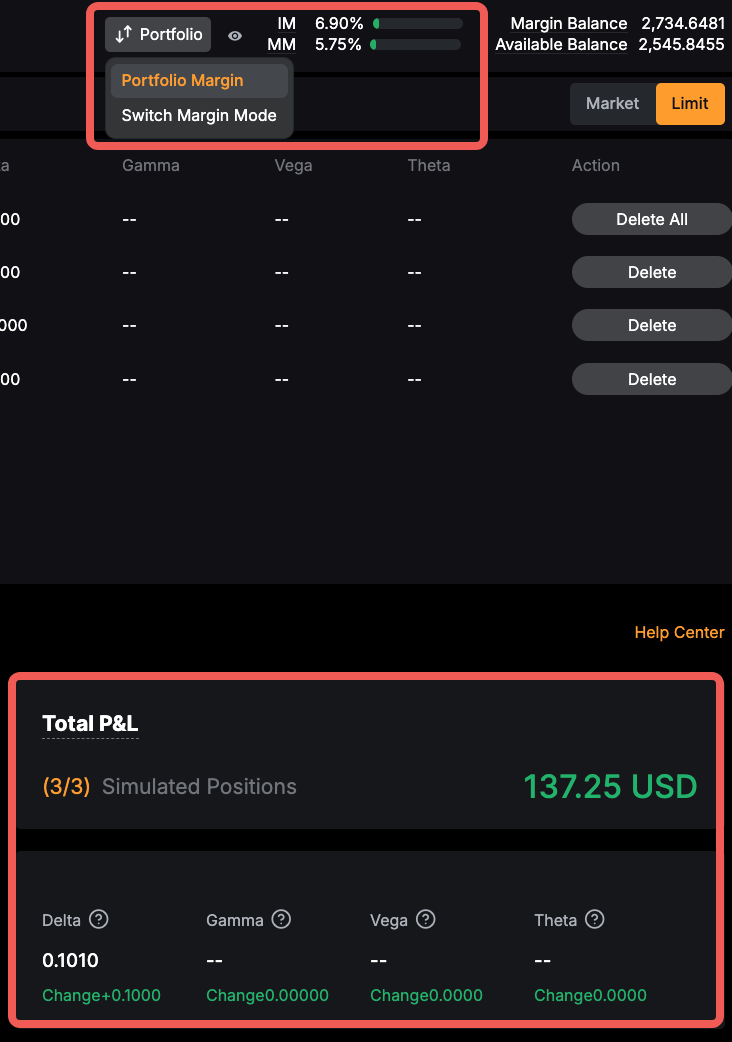On the right side of the page, you can view various important information such as overall profit and loss of the simulated position, margin occupied, and Greek value.