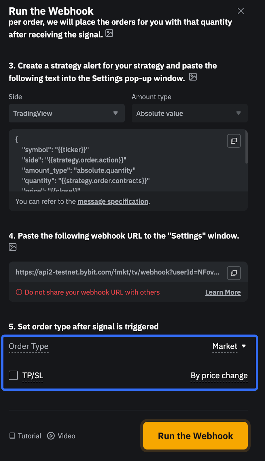 — The Webhook URL will be found in the Bybit page and should be pasted to the Webhook URL field in the alert notification tab.