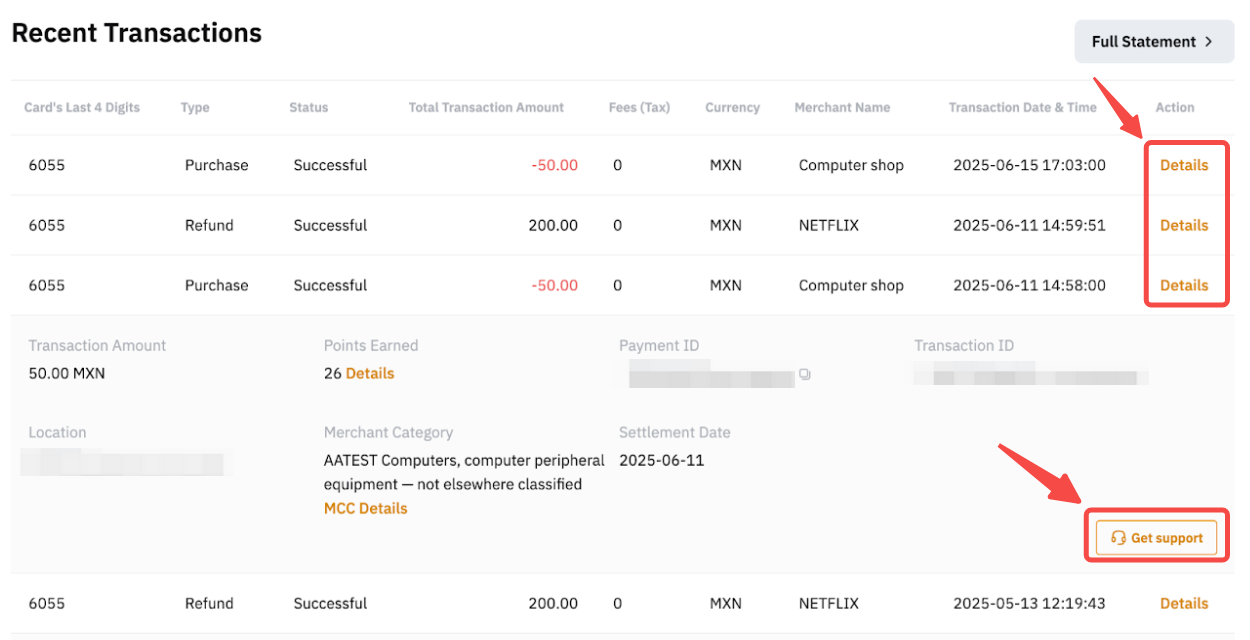 Step 1: Log in to your account and click My Bybit Card. Scroll down to Recent Transactions, then click Details → Get support.