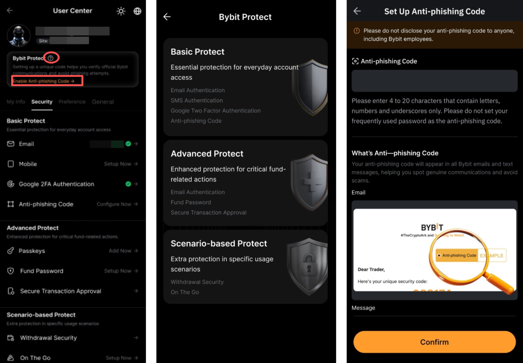 - Always check the anti-phishing code in emails or SMS messages from Bybit to ensure the message is legitimate.