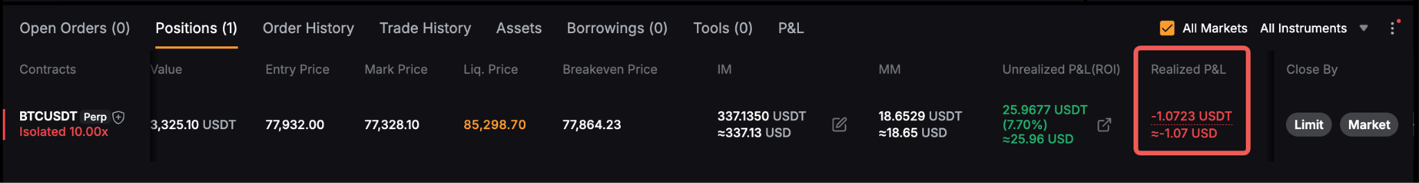 Unrealized P&L% = [ 100 USDT / ( 140 USDT + 0.693 USDT ) ] x 100% = 71.07%