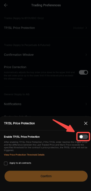 TP/SL Price Protection is specifically designed for setting TP/SL using the Last Traded Price (LTP) as the trigger reference price on Perpetual and Futures Contracts. The Price Protection settings will not apply to TP/SL orders using Mark Price or Index Price as the trigger reference. Orders placed via API won’t be affected by the Price Protection function.