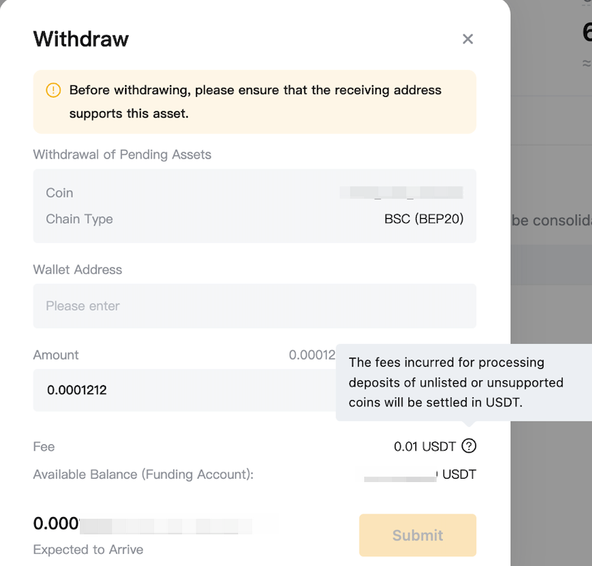 Note: A fixed handling fee in USDT for unsupported coin withdrawal will be deducted from your Funding Account. If you don’t have sufficient USDT in your Funding Account you can transfer from other accounts or make a deposit. For more information, please refer to How to Transfer Assets on Bybit or How to Make a Deposit.