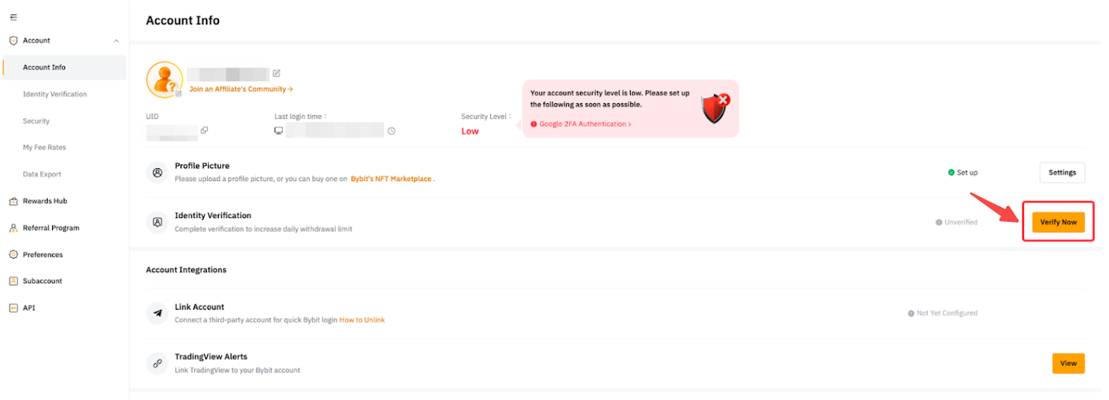 Paso 2: Haz clic en Verificar ahora en la columna Verificación de identidad en Información de la cuenta para acceder a la página Verificación de identidad.