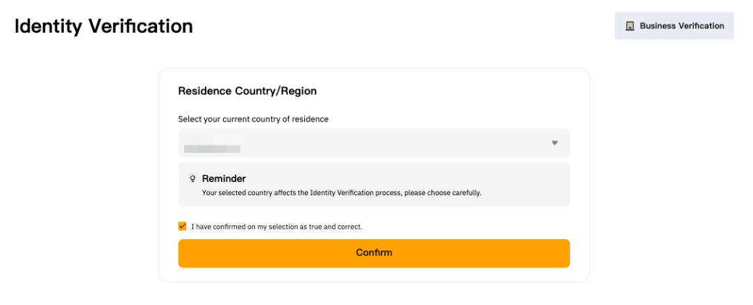 Paso 3: Elige tus países de residencia actuales. Selecciona el país y la región de residencia precisos, ya que pueden influir en tu proceso de verificación. Es posible que se requiera verificación adicional si deseas realizar cambios después de la confirmación.