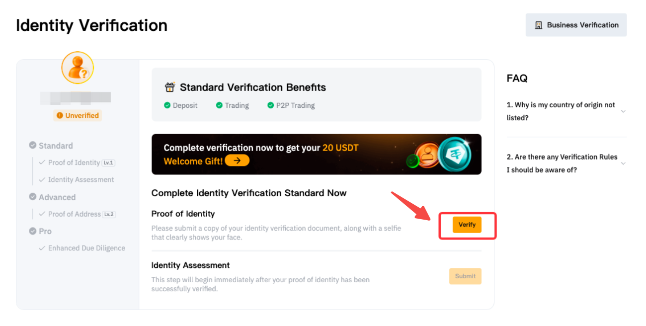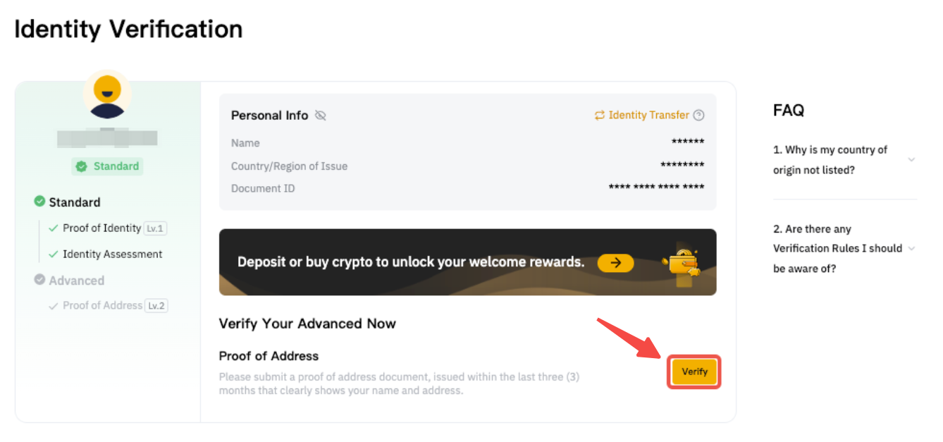 La verificación de identidad individual se divide en tres niveles: Estándar, Avanzado y Pro. Las diferencias en los beneficios y los límites de retiro entre estos tres niveles se pueden encontrar en Beneficios de diferentes niveles KYC. Este artículo proporciona una guía paso a paso para completar la verificación de identidad de nivel Estándar, Avanzado y Pro.