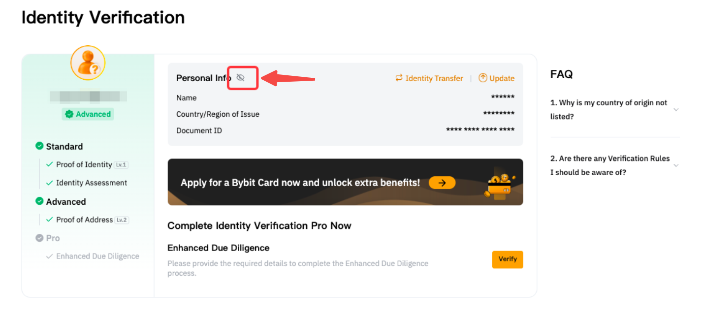 Para completar el nivel Pro de verificación de identidad, haz clic en Verificar para proporcionar los detalles necesarios para completar el proceso de diligencia debida mejorada (EDD). El EDD requiere que completes un cuestionario y proporciones documentos de respaldo para tu prueba de ingresos.