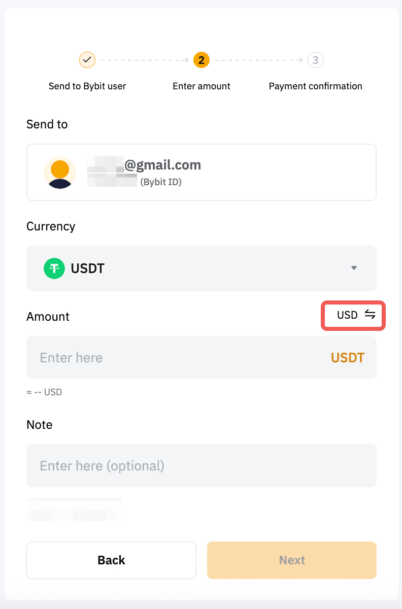 ステップ3:送信する通貨の金額を入力し、支払目的を示すメモを入力します(任意)。