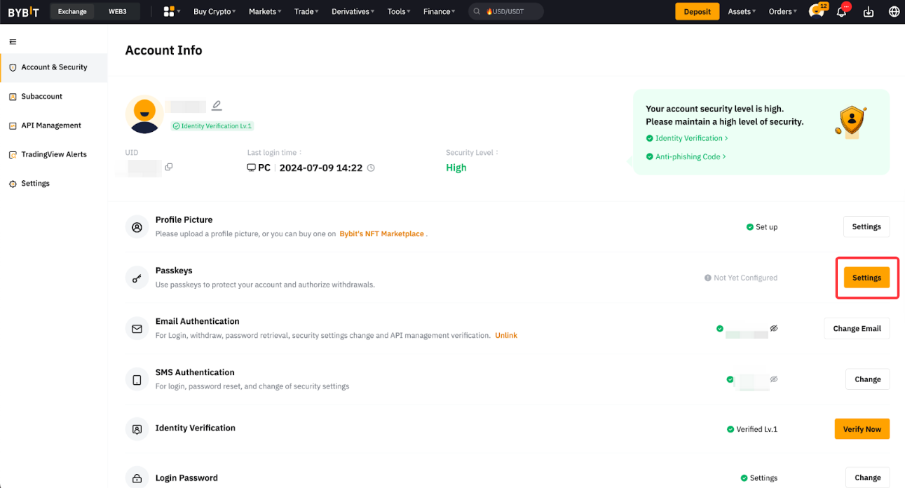 ステップ1: Bybitアカウントにログインし、アカウント&セキュリティページに移動してパスキーを設定します。