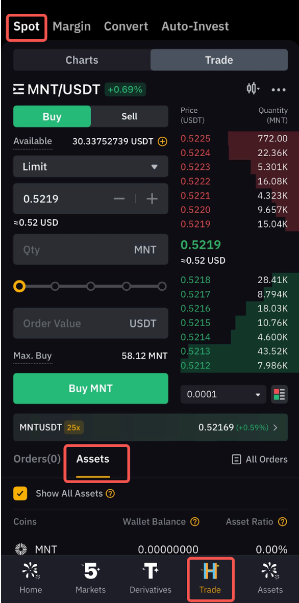 • To view your Spot Assets, you can go to the Spot Trading page → Assets.