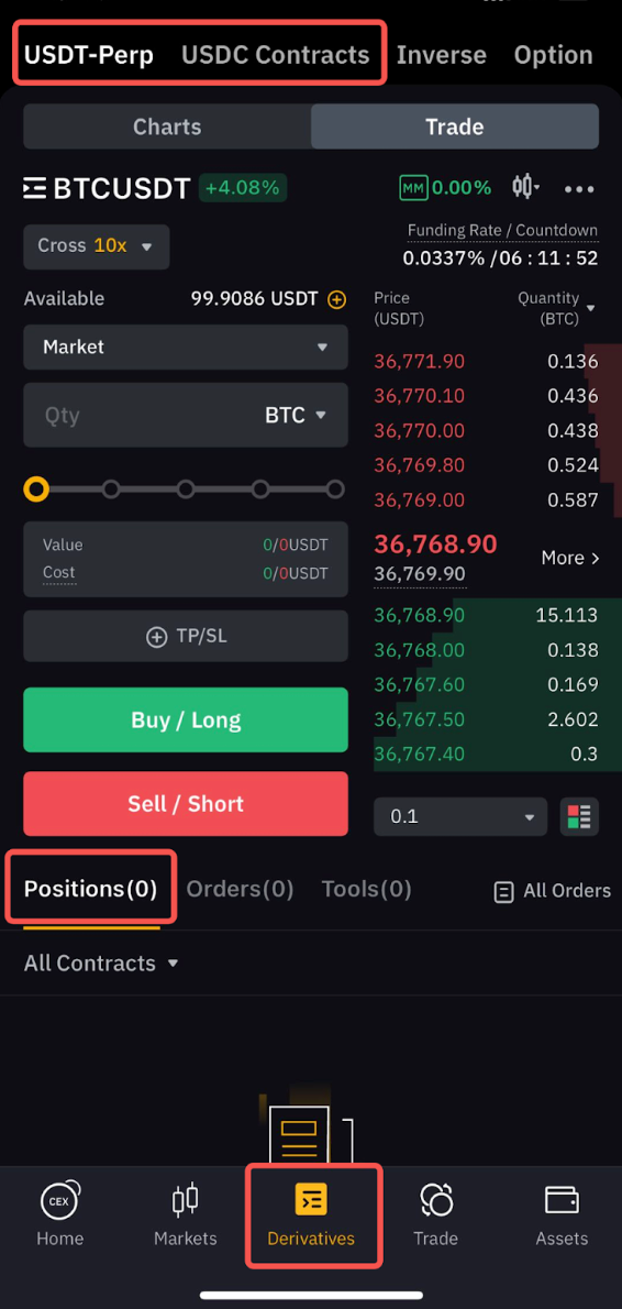 For Perpetual & Futures Positions, please tap Positions on the Derivatives Trading page. You may go to the Asset list on Spot Trading to view your Spot assets and check your Funding Income from the Transaction Log