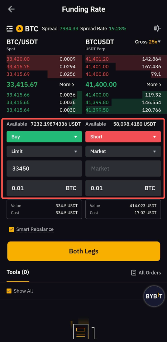 • Select Market or Limit Orders. When entering the order price, you can refer to the Funding Rate or Spread Rate next to the trading pair to gauge the arbitrage cost.