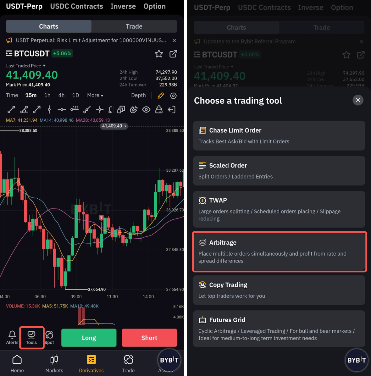 Step 1: Head to the trading page, tap Tools and select Arbitrage.
