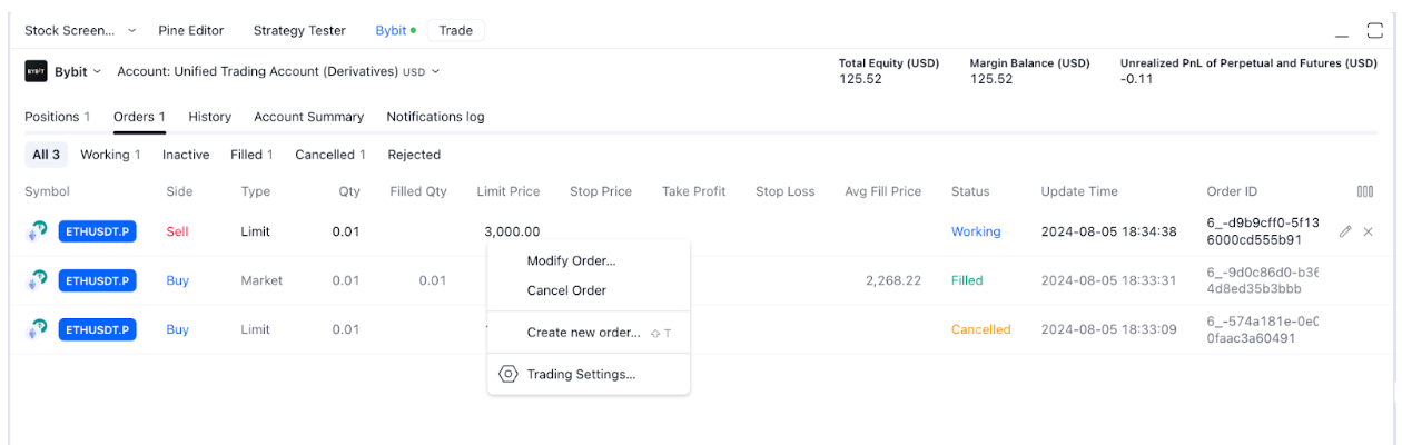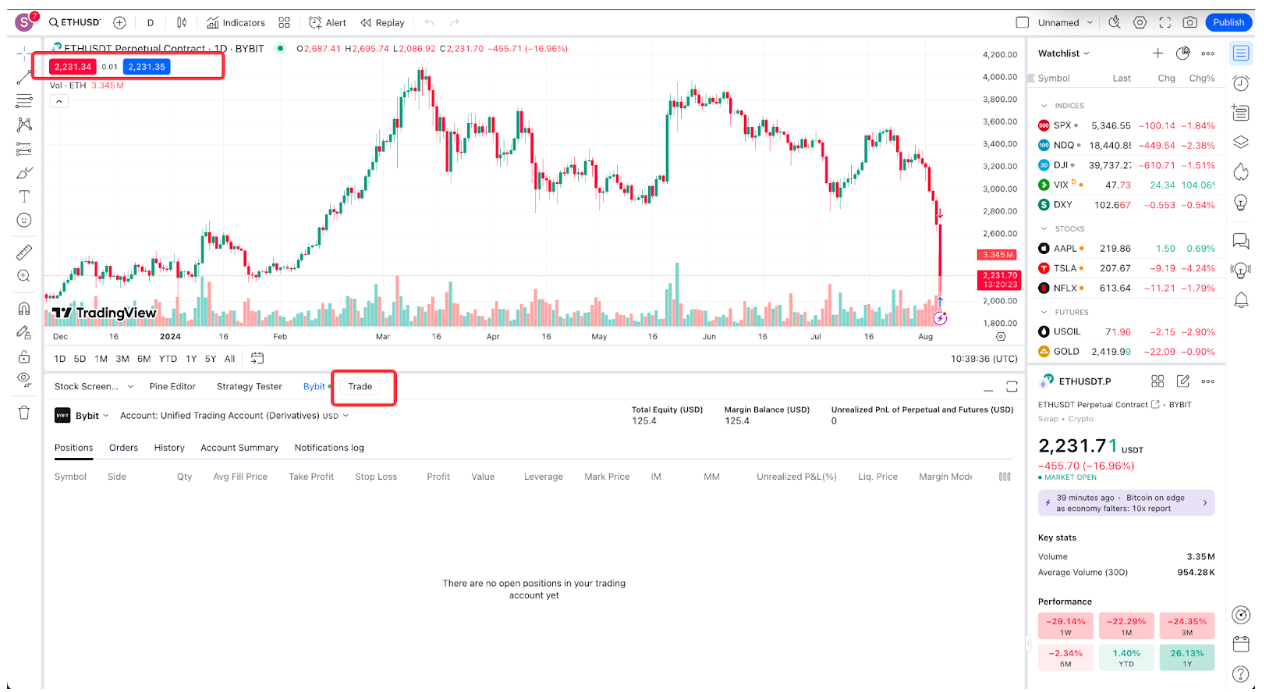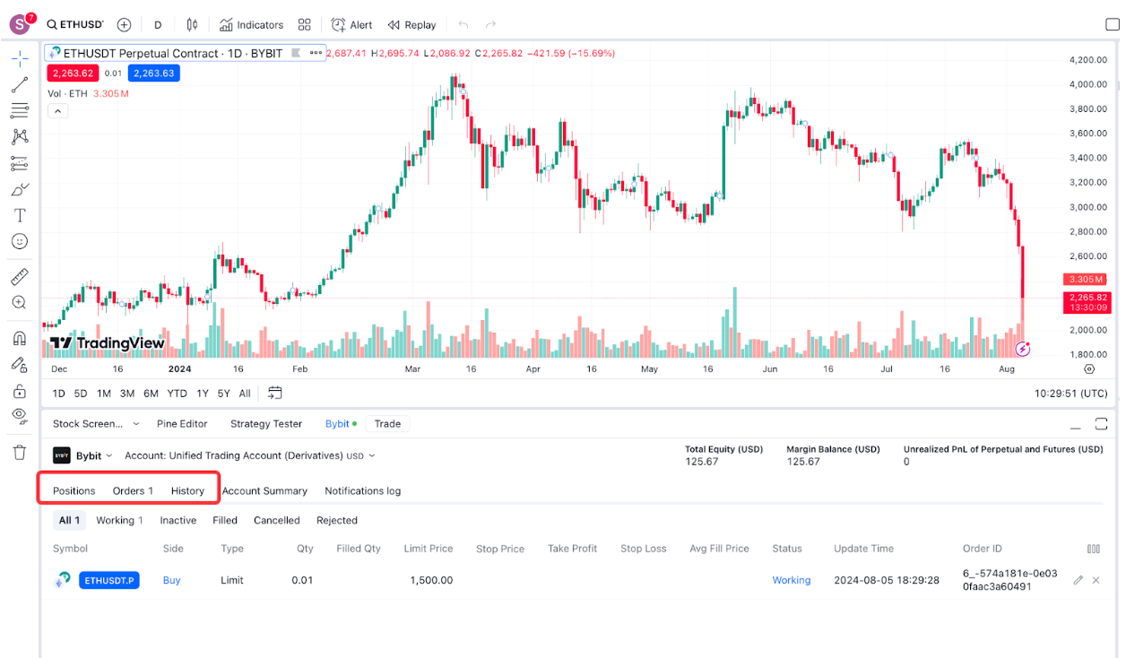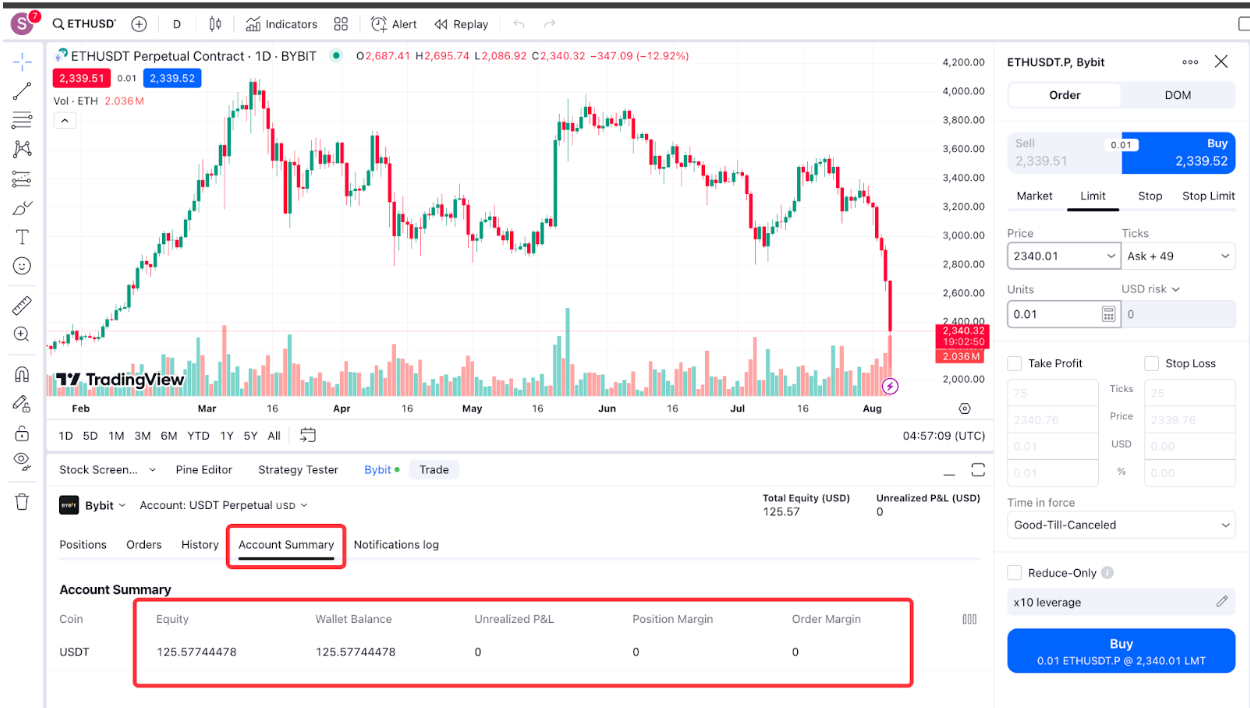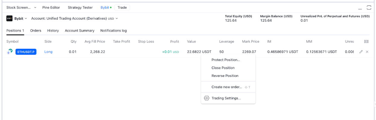 5º passo: Você acessou sua Conta Bybit e já pode negociar na Bybit a partir do TradingView.