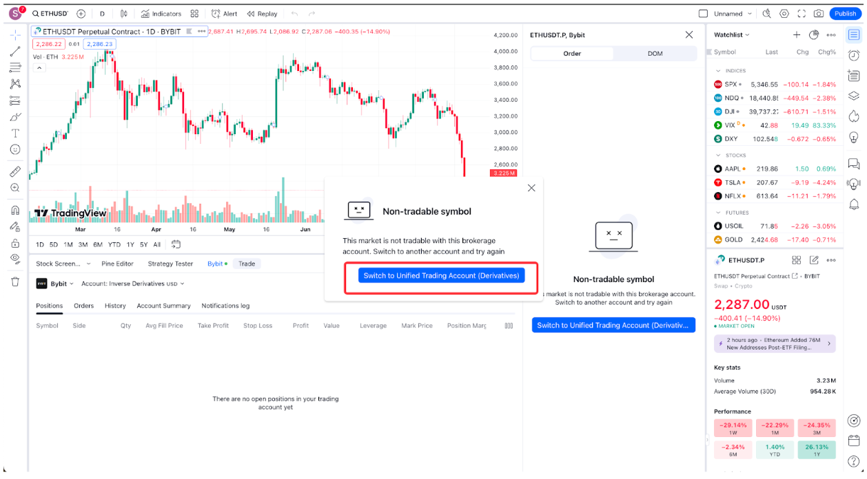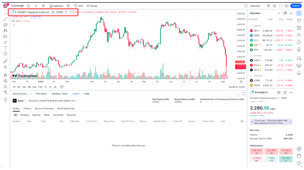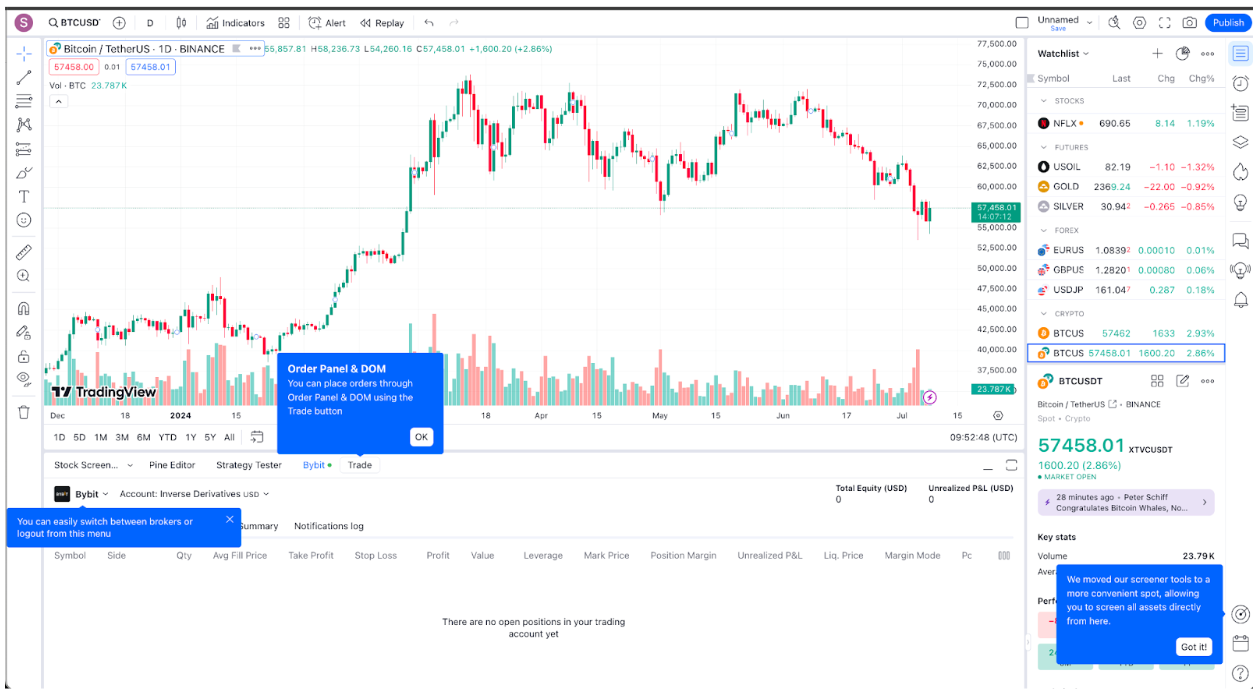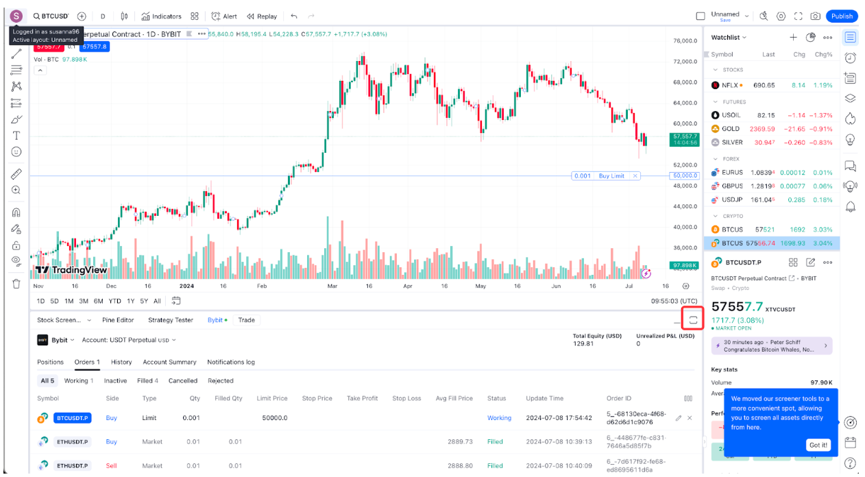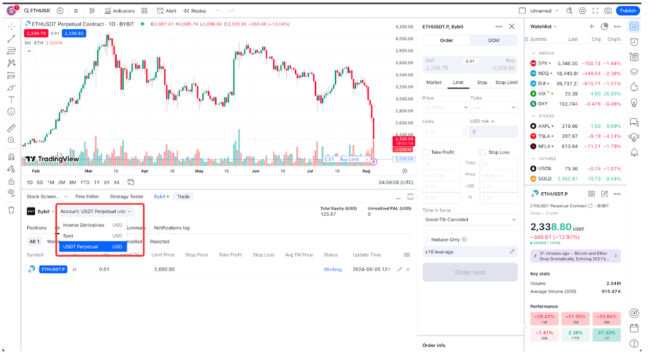 5º passo: Você acessou sua Conta Bybit e já pode negociar na Bybit a partir do TradingView.