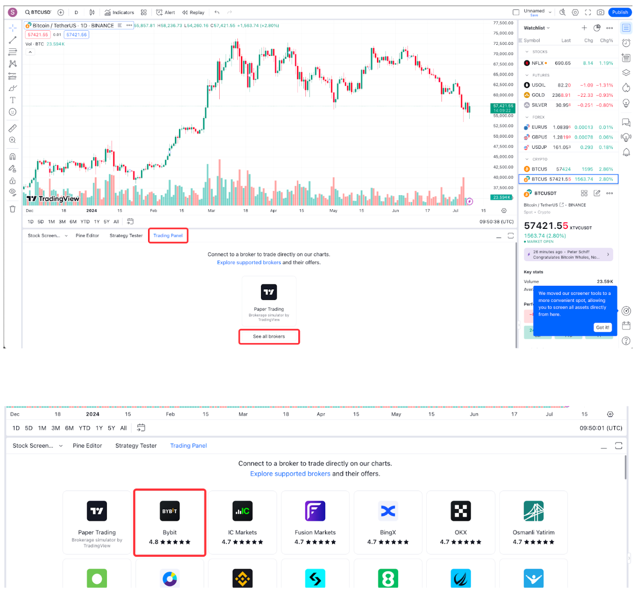 2º passo: Em Painel de negociação, vá até a seção de corretoras disponíveis e clique em Ver todas as corretoras Bybit.