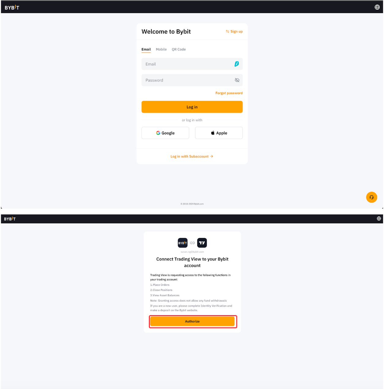 4º passo: Digite suas credenciais de login da Bybit e clique em Login e Autorizar.
