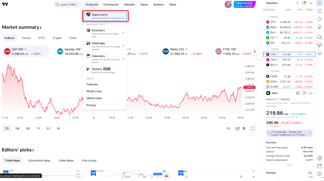 1º passo: Faça login em sua conta do TradingView. Na página inicial, clique em Produtos Supergráficos.