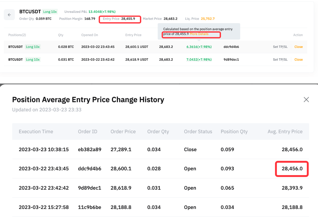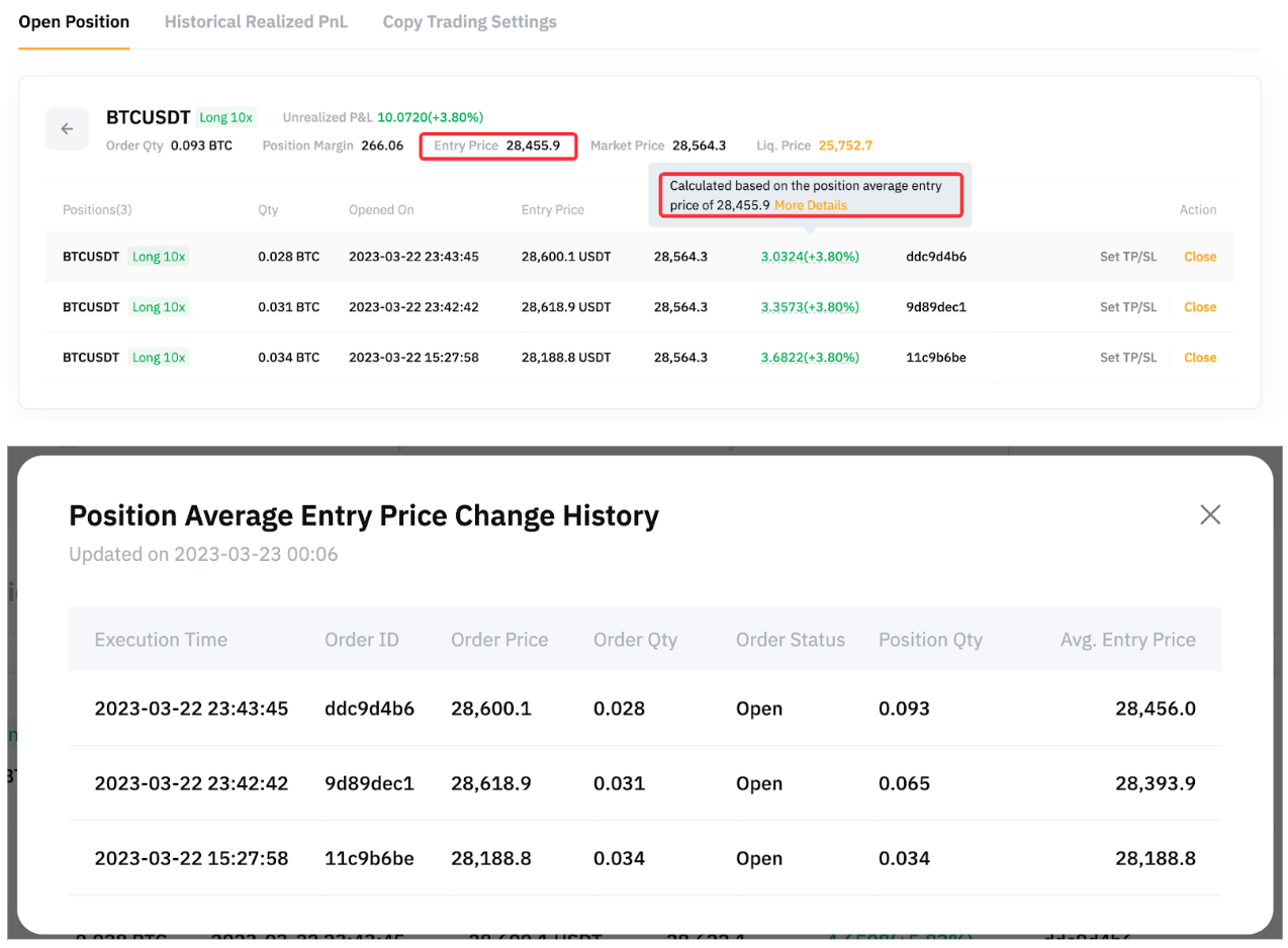 Потім майстер-трейдер B розміщує ще два ордери, а підписник A успішно копіює їх з кількістю 0,031 BTC і 0,028 BTC і ціною входу за ордером 28 618,90 USDT і 28600,10 USDT, відповідно. На вкладці Відкрита позиція він бачить, що середня ціна входу в позицію фактично складає 28 455,90 USDT, і ця ціна лягає в основу розрахунків нереалізованого або закритого P&L. Підписник А може переглянути історію змін середньої ціни входу в позицію, навівши курсор на підкреслене значення нереалізованого P&L і натиснувши Детальніше. Середня ціна входу обчислюється так: (0,034 x 28 188,8 + 0,031 x 28 618,9 + 0,028 x 28 600,1) / 0,093 ≈ 28 455,90 USDT