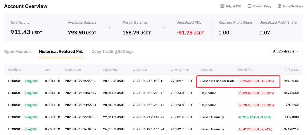На сторінці «Історія реалізованого P&L» видно, що ордер закрито через копіугоду, де закритий P&L склав –39,1548 USDT.