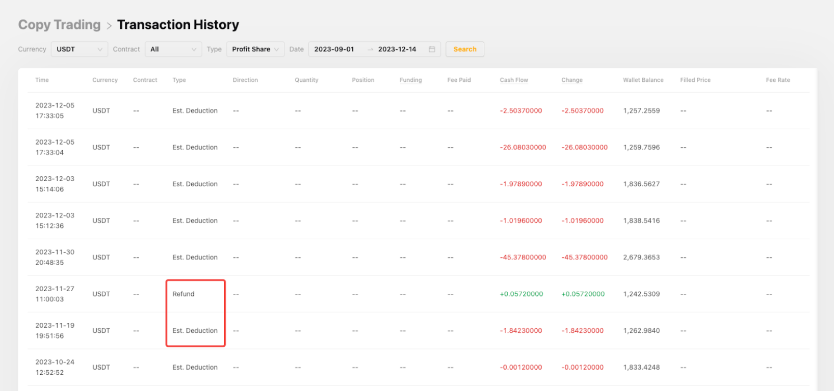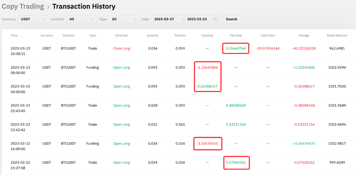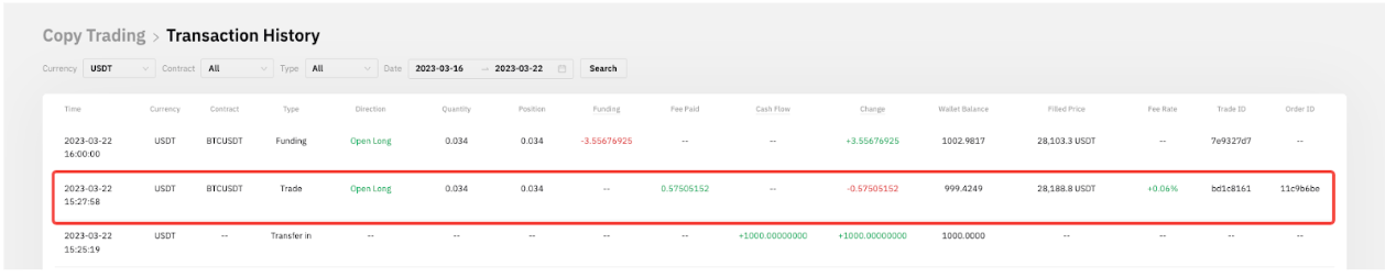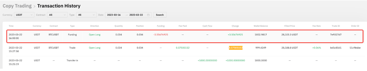 На 16:00 UTC позиція не закрита, тому стягується комісія за фінансування. На наведеному нижче знімку екрана видно, що ставка фінансування має від’ємне значення, тому підписник A отримав суму комісії за фінансування за свою довгу позицію. Його доступний баланс за цим майстер-трейдером було збільшено на 3,55676925 USDT.