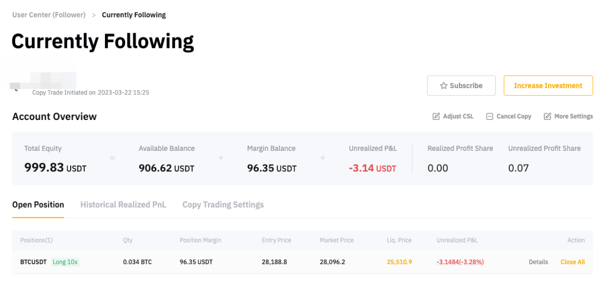 Підписник A починає відстежувати майстер-трейдера B з інвестицією 1000 USDT і через деякий час успішно копіює його угоду. Відкривається довга позиція на 0,034 BTCUSDT з ціною входу за ордером 28 188,80 USDT.
