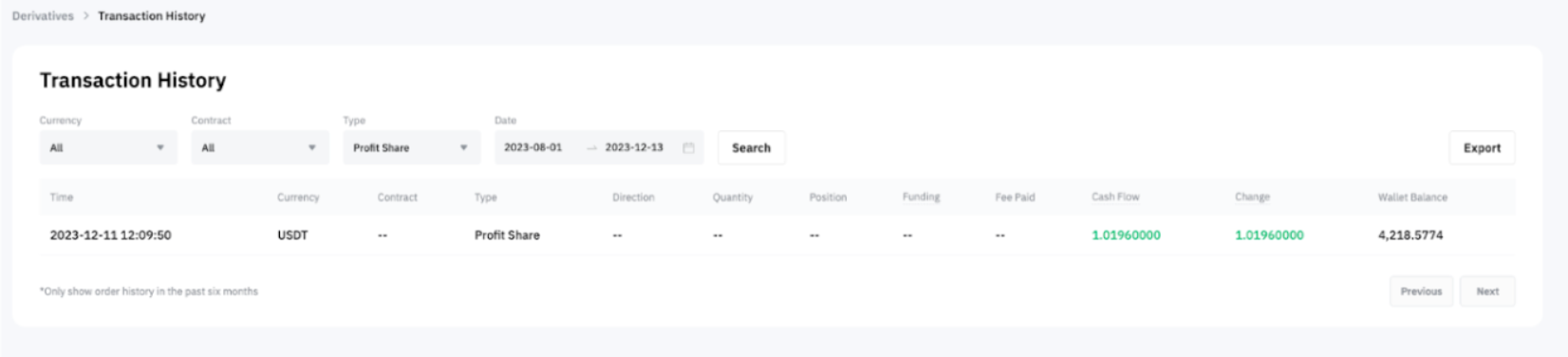 — Як Master Trader, ви можете переглядати свій запис про частку прибутку в історії рахунків похідних фінансових інструментів або журналі транзакцій уніфікованого торгового рахунку (для Master Trader, оновленого до UTA).