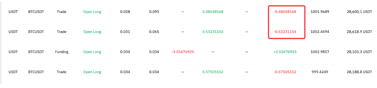 Можливо, ви не зрозумієте, чому розмір закритого P&L не збігається з останньою зміною трансакції. Це пояснюється тим, що закритий P&L включає чисту торгову комісію та комісію за фінансування, реалізовану за кількома останніми транзакціями в історії. При цьому комісія за фінансування для закритого P&L стягується пропорційно до закритого обсягу, відображаючи реальний закритий P&L для цього ордера. Нижче показано розрахунок закритого P&L для частково закритої позиції.
