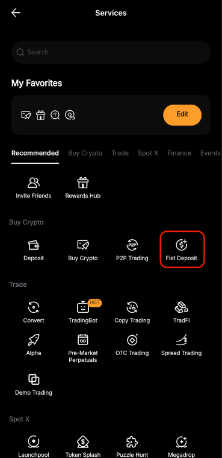 У додатку перейдіть на головну сторінку та торкніться «Більше», а потім виберіть «Фіатний депозит». Потім натисніть на фіатну валюту, щоб переглянути комісії для кожного доступного способу оплати.