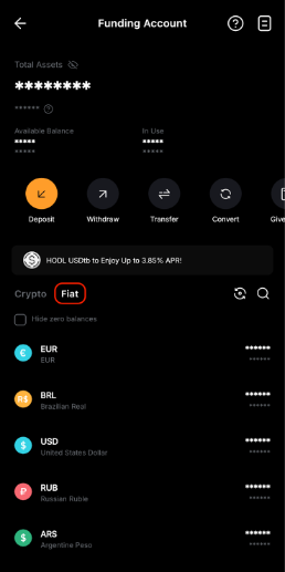 У додатку перейдіть на сторінку «Активи» та торкніться «Фінансування» → «Фіат». Потім натисніть на фіатну валюту і ознайомтеся з відповідними комісіями для кожного способу оплати.
