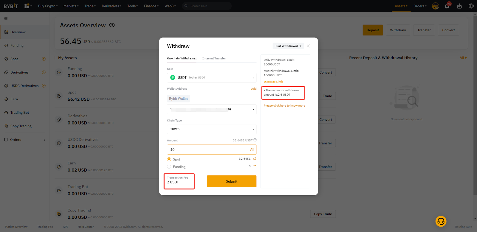 За внутрішні перекази на інший акаунт Bybit комісія за виведення не стягується.