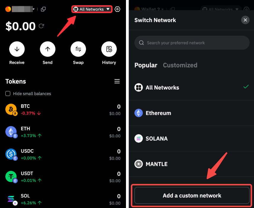 Крок 1. Щоб додати користувацьку мережу, відкрийте розширення Bybit Wallet і натисніть Усі мережі → Додати користувацьку мережу.