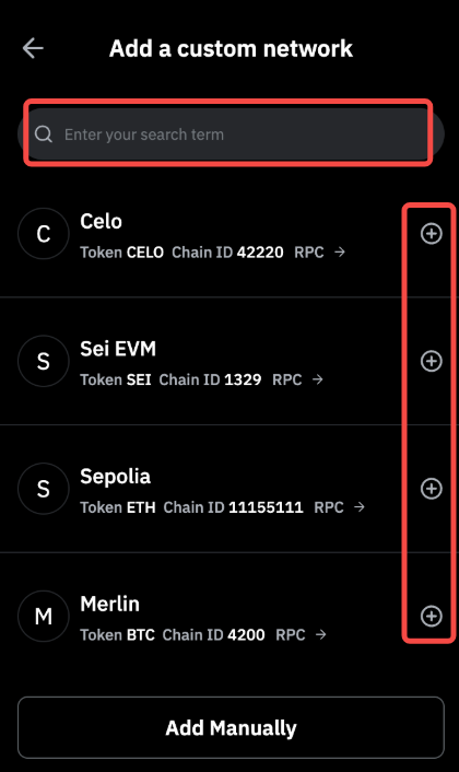 Крок 2. Введіть дійсне ім’я мережі та після того, як ви знайдете мережу, натисніть значок +, щоб додати її до гаманця.