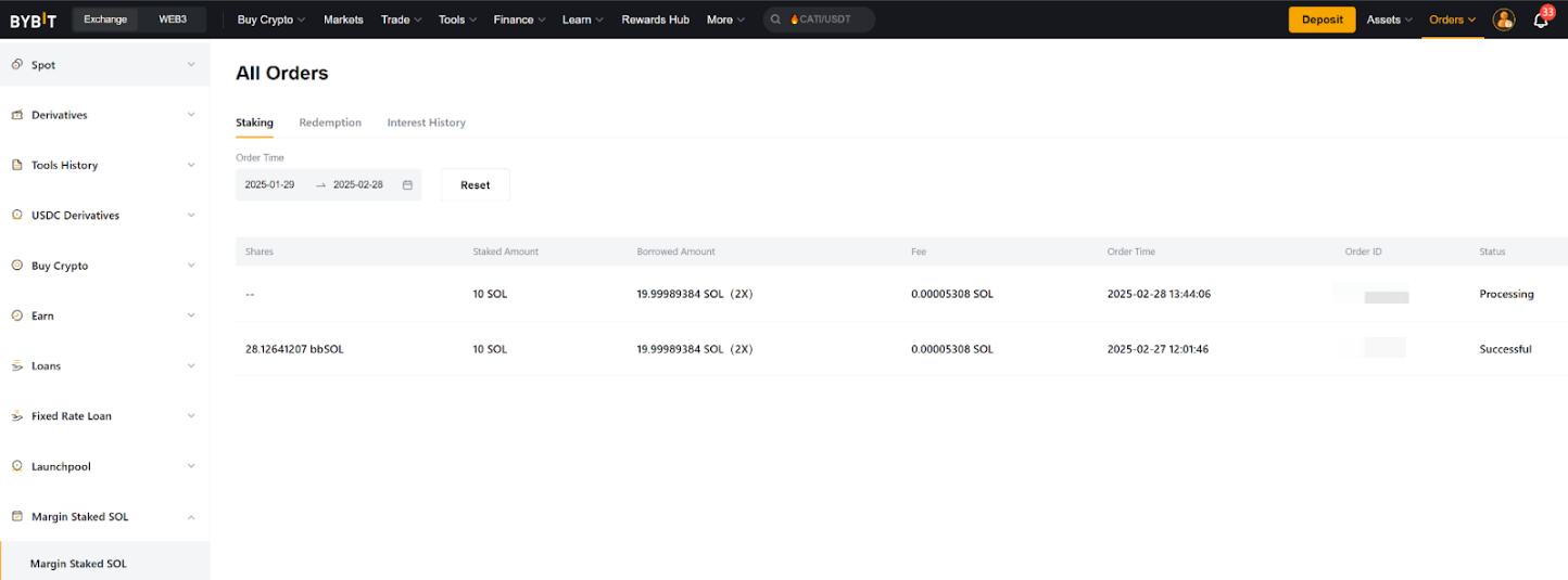 Крок 2. На сторінці Ордери маржинального стейкінгу SOL ви знайдете докладнішу інформацію в розділі Стейкінг, Викуп і Історія нарахування відсотків.