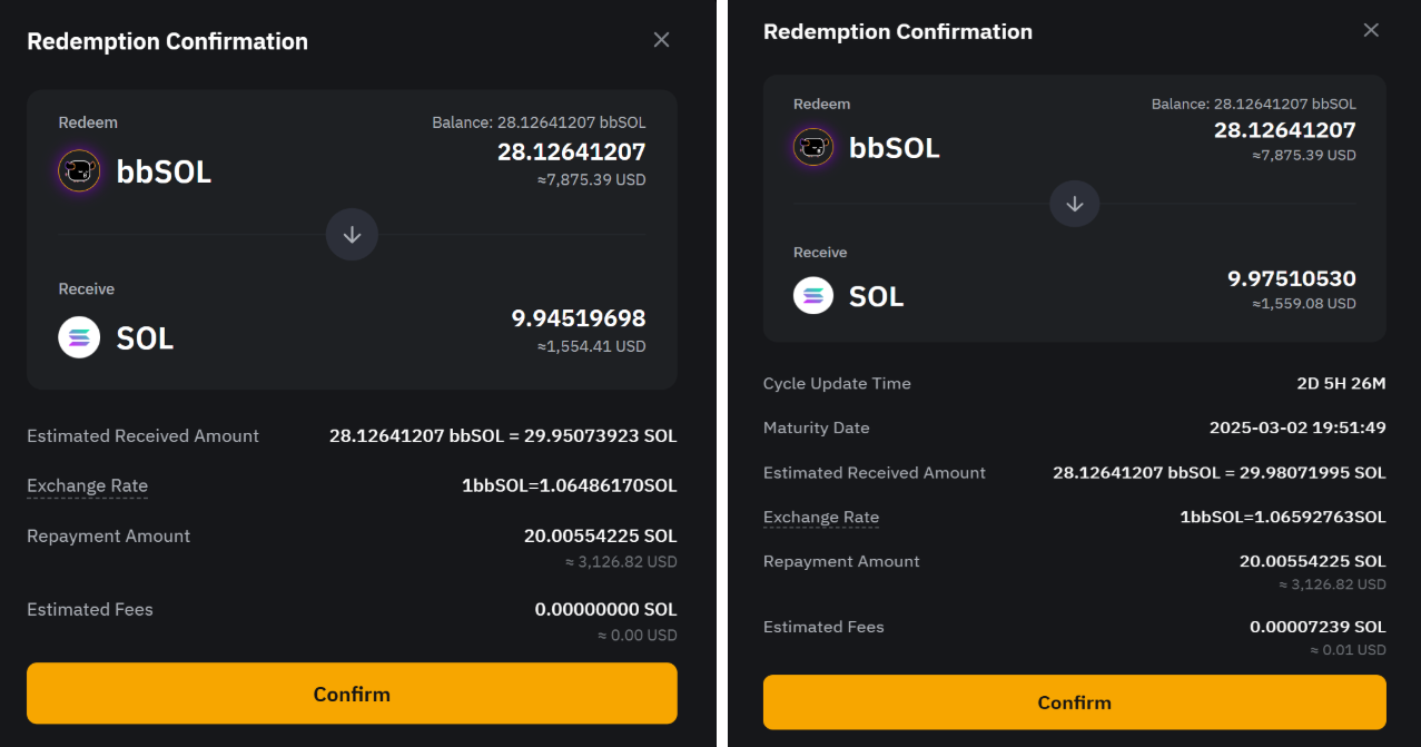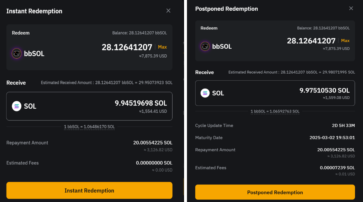 • Відкладений викуп: Отримайте повну основну суму та всі прибутки після 1–4-денного періоду обробки, протягом якого відсотки продовжуватимуть нараховуватися. Ваші bbSOL буде конвертовано в SOL за актуальним курсом обмін, коли ви подасте запит на викуп.