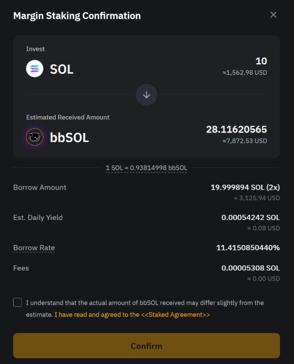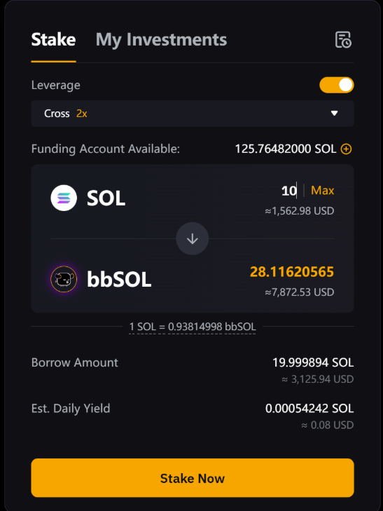 Очікувана сума bbSOL, яку ви отримаєте, розрахована на основі вашого кредитного плеча, суми SOL у стейкінгу та актуального курсу обміну між SOL і bbSOL.