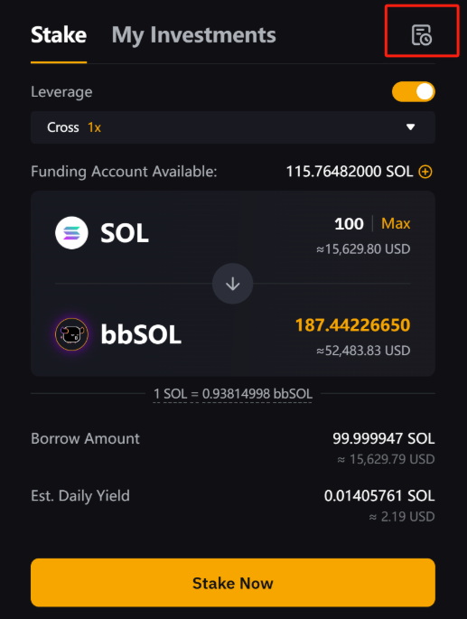 Крок 1. Щоб перевірити свої ордери, натисніть значок історії у верхньому правому куті панелі Стейкінг або Мої інвестиції на домашній сторінці SOL у маржинальному стейкінгу.