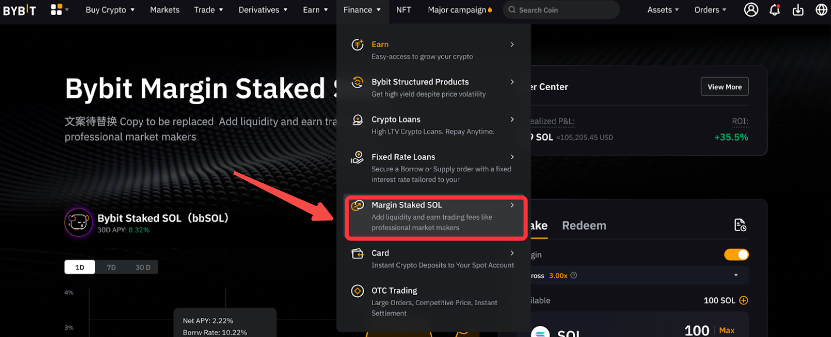 Крок 1. Натисніть ФінансиSOL у маржинальному стейкінгу на панелі навігації, щоб перейти на необхідну сторінку.