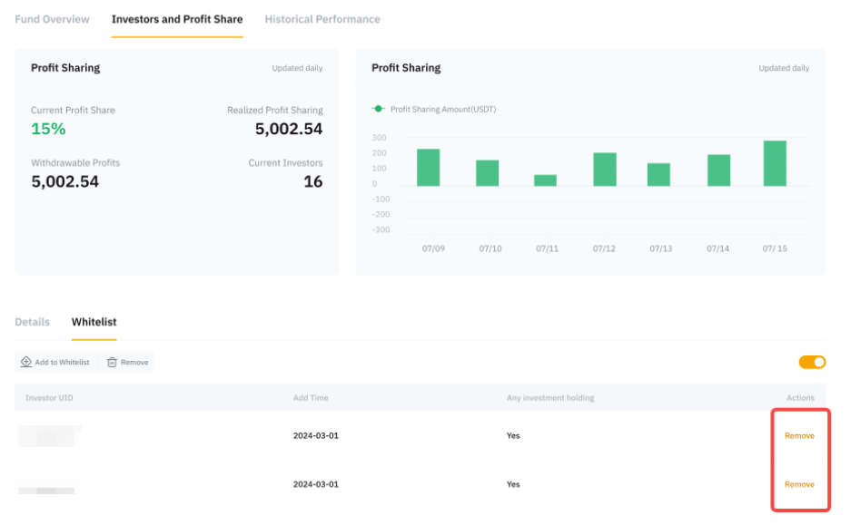 Щоб видалити Інвестора з білого списку, перейдіть до Центру майстра Pro → Інвестори та розподіл прибутку → Білий список, знайдіть Інвестора, якого ви хочете видалити, та натисніть Видалити.