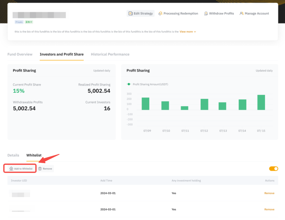 Крок 1. Перейдіть до вашого Центру майстра Pro → Інвестори та розподіл прибутку → Білий список і натисніть Додати до білого списку.