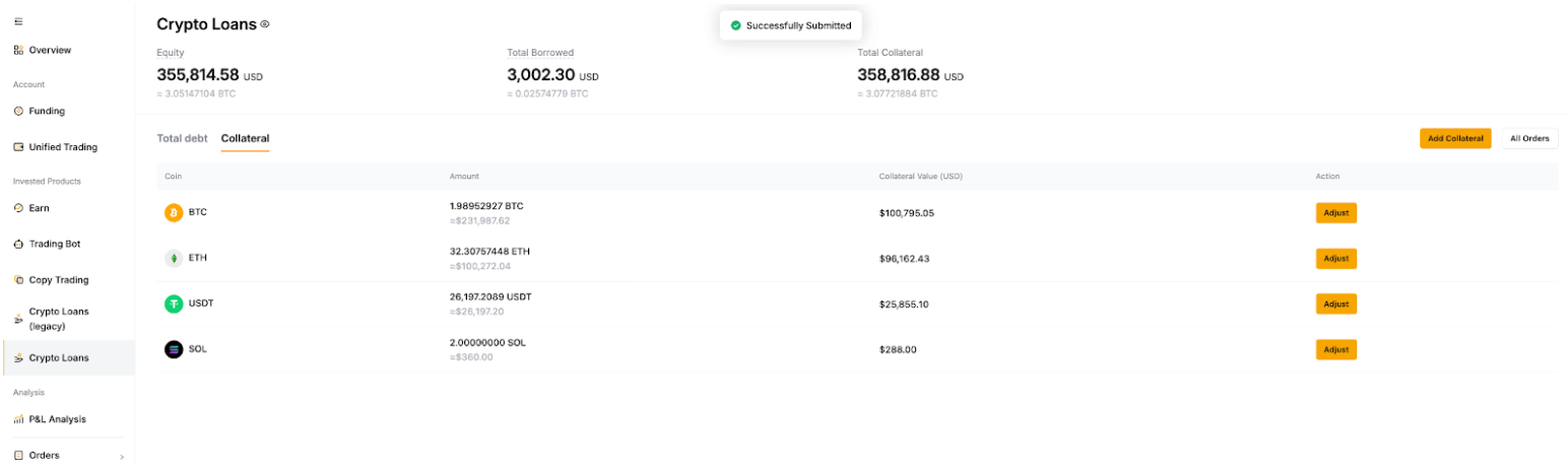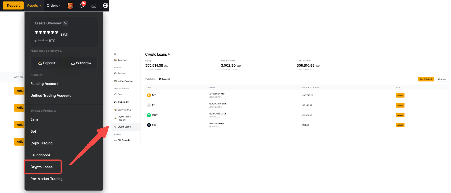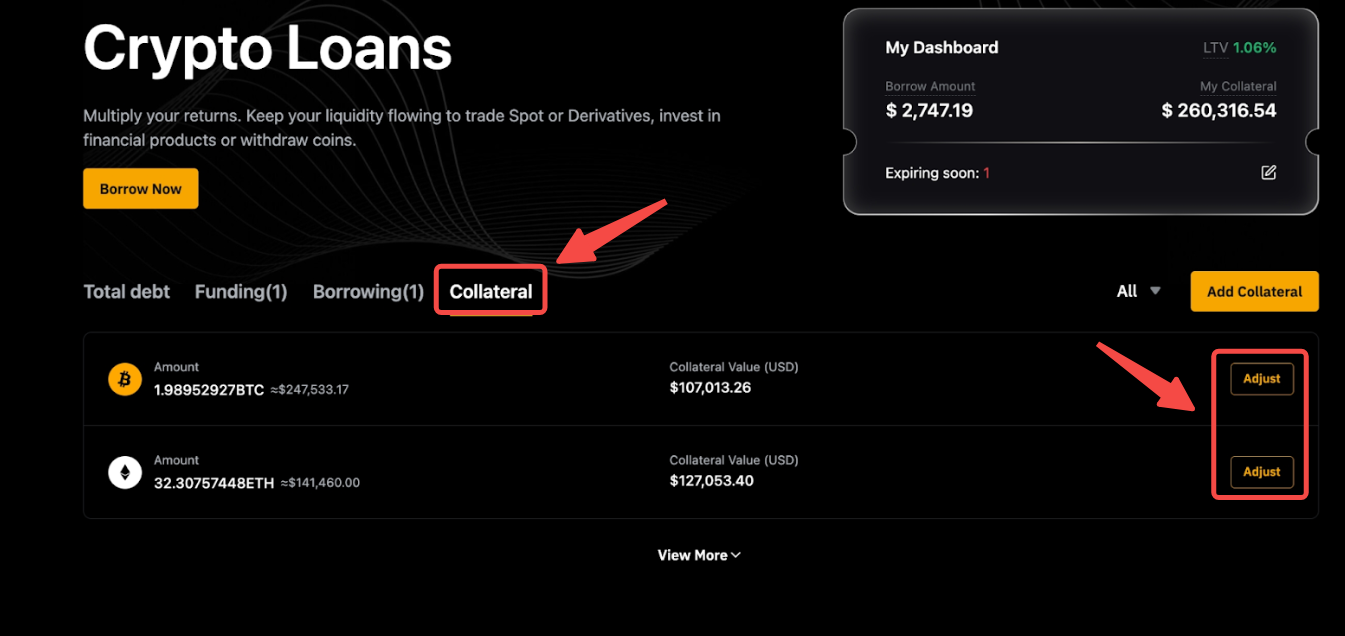 Або натисніть АктивиКрипто-кредити у верхньому правому куті сторінки. У вкладці «Препарати Crypto» натисніть на «Відрегулювати заставну суму» в стовпці, де ви хочете скоригувати.