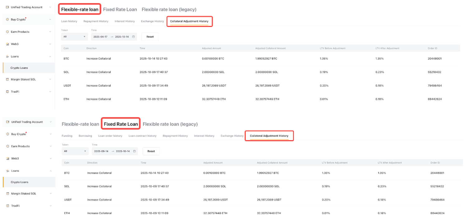 Ви можете переглянути зміни у співвідношенні LTV у розділі Зобов’язання — Історія гнучких/фікованих Історія коригування застави.