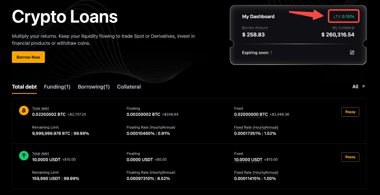 Ви можете переглянути коефіцієнти LTV у верхньому правому куті сторінки Криптопозики.