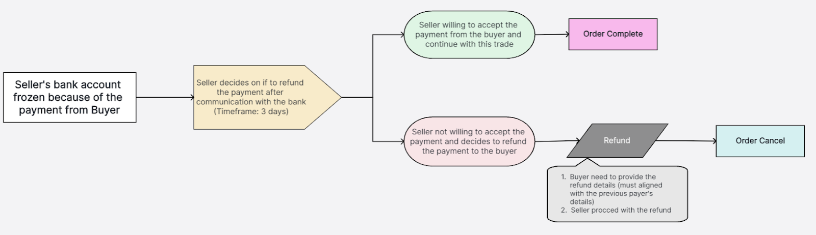 • Якщо продавець вирішує скасувати ордер: Bybit допоможе розпочати процес повернення коштів. Однак зауважте, що відшкодування може бути затримане або призупинене, якщо банківський рахунок продавця залишається замороженим. Повернення коштів можна обробити лише після скасування заморожування акаунта.