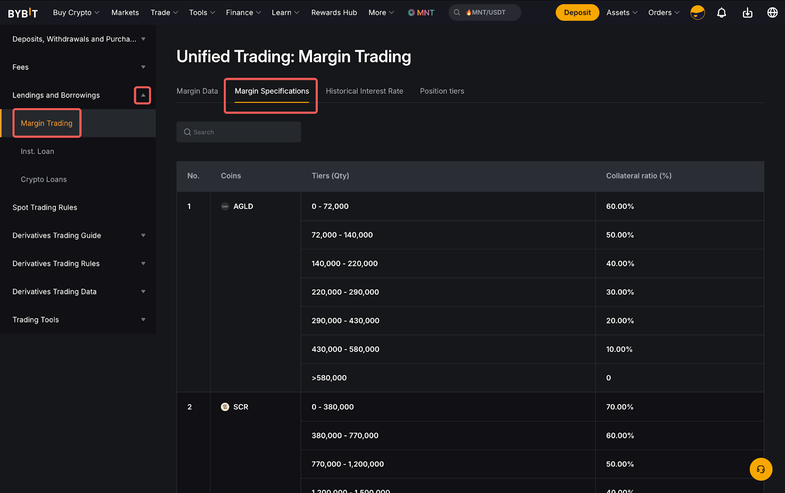 如需查看抵押和可借资产详情,请前往“衍生品交易”页面,然后点击“衍生品资讯”。然后,点击“借贷” “杠杆交易”→ “保证金规格”