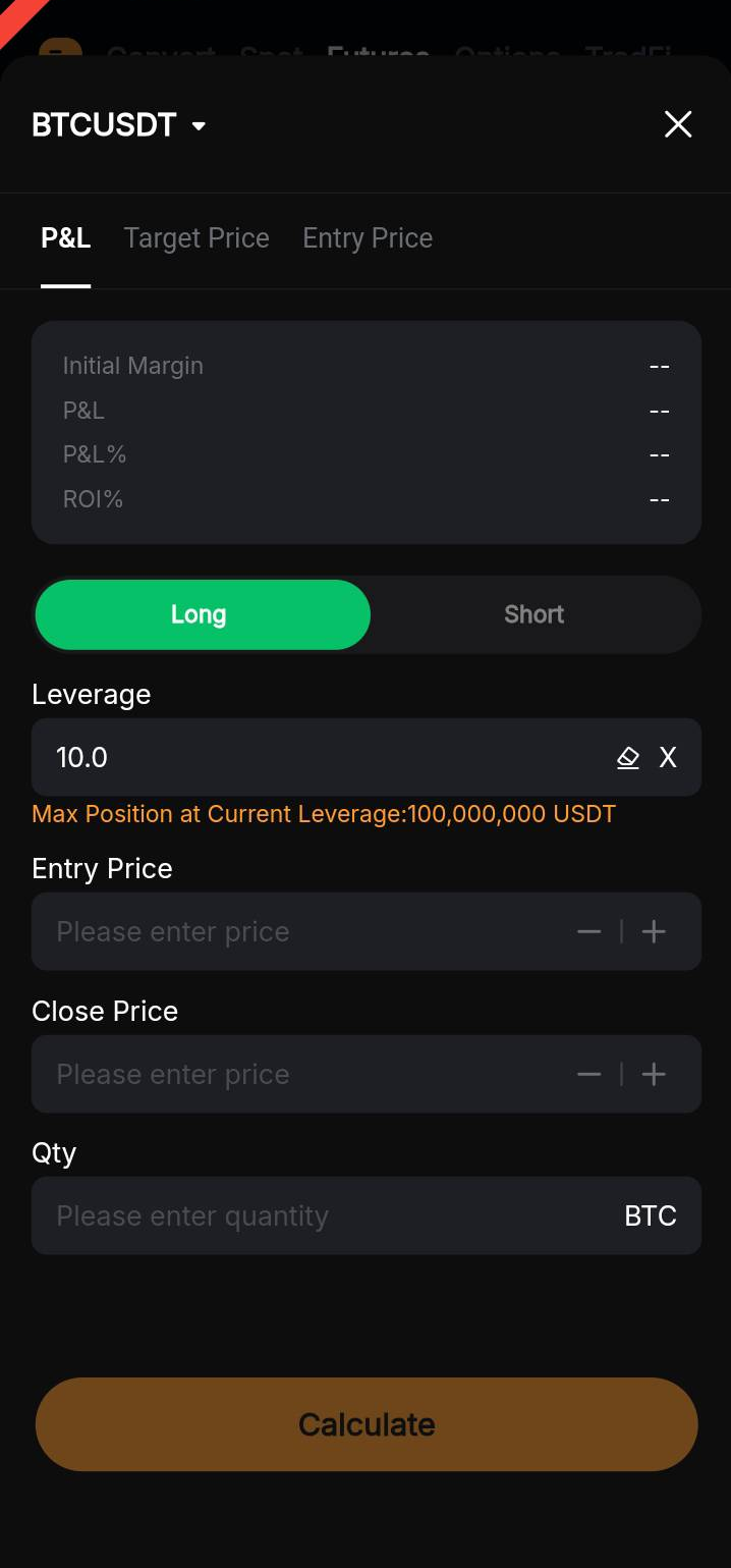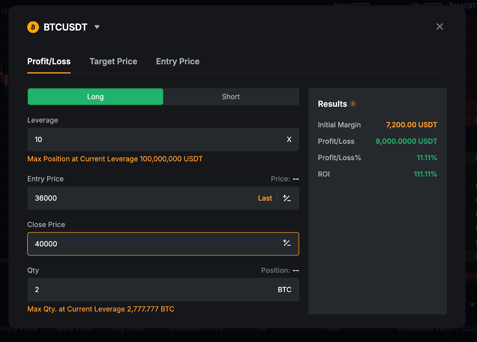 您可以通过输入杠杆倍数合约数量入场价格平仓价格来计算您仓位的起始保证金、收益、收益率回报率