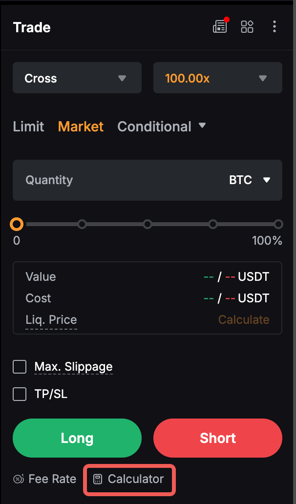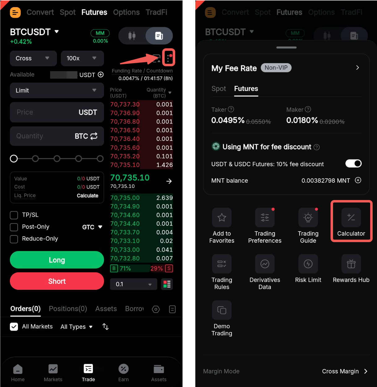 第 1 步:在网页端,您可以在下单区的左下角找到 Bybit 计算器。如果您使用的是 App,请前往交易并点击右上角的省略号图标,打开交易设置页面。