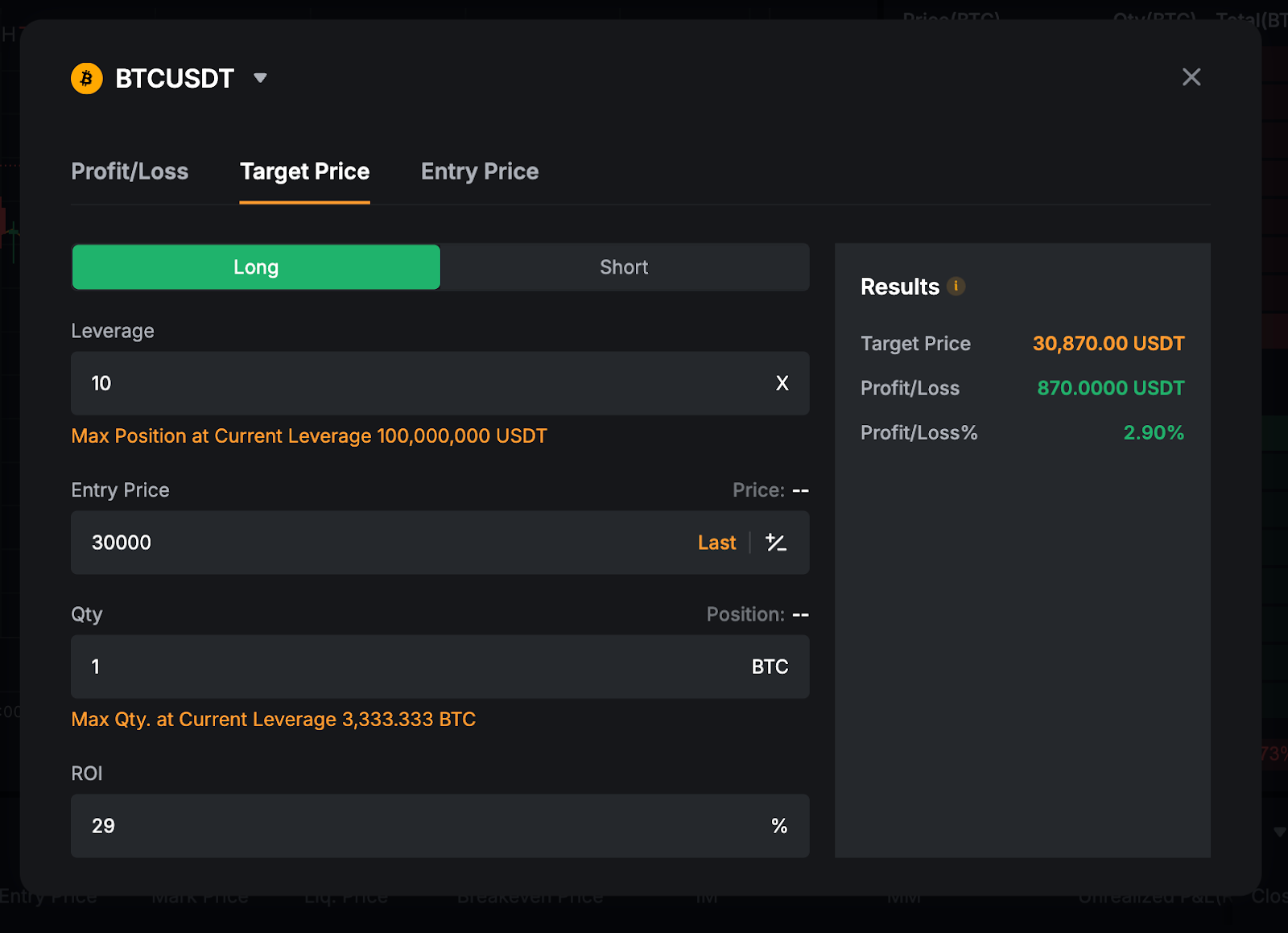 通过计算所需的回报率来确定平仓时的预估目标价格(不考虑手续费)。
